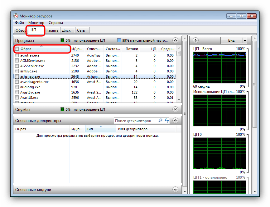 Когда откроется стандартное приложение, необходимо переключиться на вкладку «ЦП» и отыскать в перечне процессов файл «exe». Затем кликните по нему для просмотра детального описания в нижней части окна: