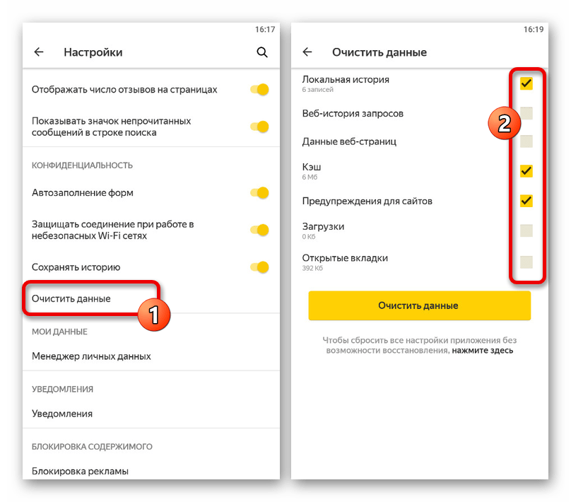 Найдите подраздел «Конфиденциальность» и коснитесь пункта «Очистить данные». После этого необходимо отметить галочкой «Локальную историю», «Данные веб-страниц» и «Кэш».