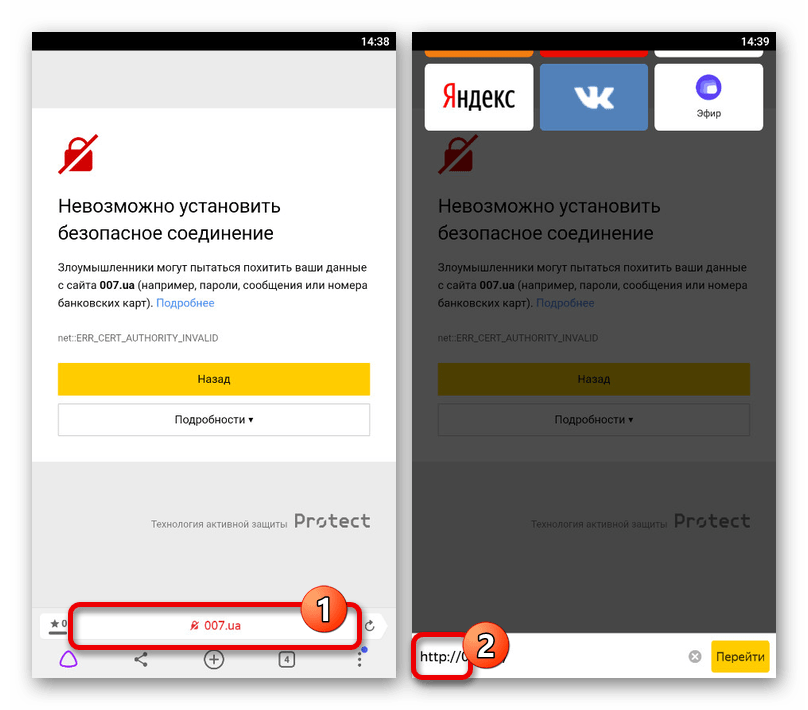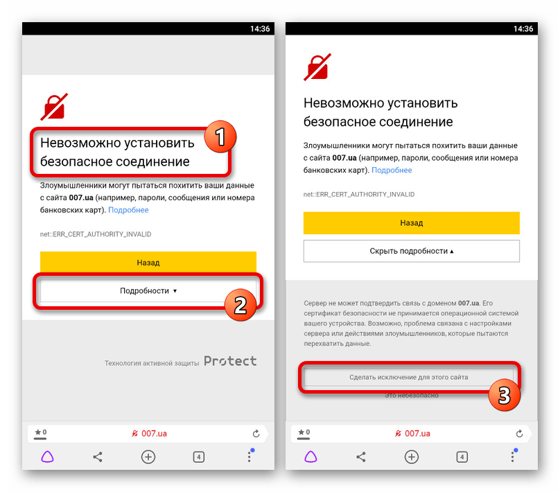 На смартфоне ошибка «Невозможно установить безопасное соединение» также не является редкостью и может быть устранена похожими на ранее представленные способами. Однако в данном случае отсутствуют настройки сертификатов и технологии Protect, что делает невозможным полное отключение защиты.
