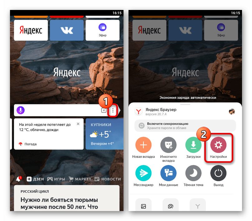 - При наличии каких-либо проблем в данных о работе обозревателя может возникать рассматриваемая ошибка доступа, избавиться от которой можно путем очистки программы. Сначала нажмите кнопку с тремя точками и перейдите в «Настройки».