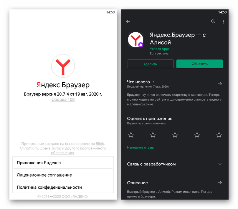 Устаревшие версии Яндекс.Браузера зачастую работают неправильно, что также относится и к встроенной системе защиты. Чтобы избавиться от ошибки в таком случае, будет достаточно обновить приложение до последней актуальной для устройства версии или же выполнить переустановку.