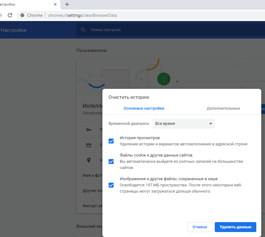 Кэш и куки браузера могут быть частой причиной возникновения ошибок с SSL сертификатами. Рекомендуем сначала очистить в браузере кэш и куки. В Chrome нужно нажать сочетание клавиш Ctrl + Shift + Delete, выберите промежуток времени (Все время) и нажмите кнопку очистки данных (Удалить данные / Clear Data).