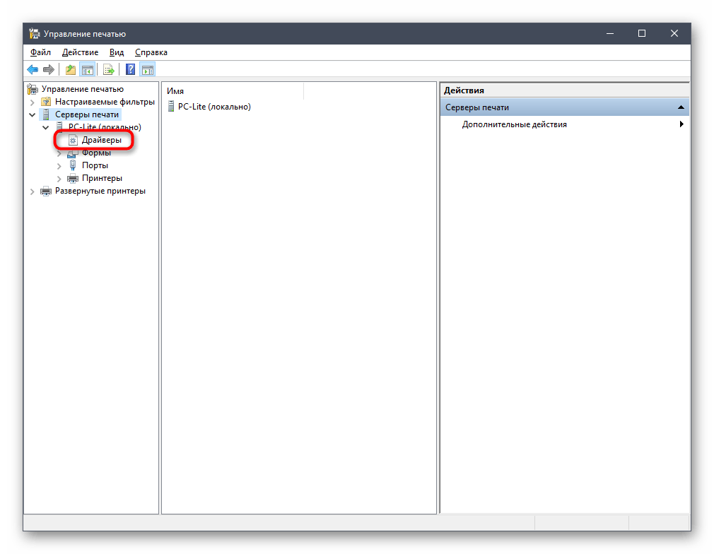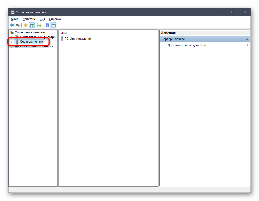 В открывшемся окне на левой панели раскройте раздел «Серверы печати».