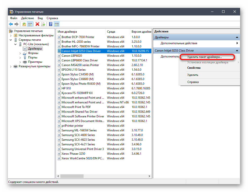 7) Теперь можно удалить пакет драйвер принтера (который не удалялся) из оснастки диспетчера печати.