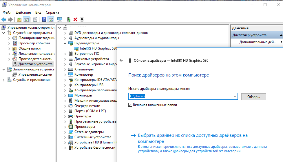 Также можно установить драйвер конкретного устройства через диспетчер оборудования. В диспетчере устройств выберите устройство, драйвер которого вы хотите заменить, выберите пункт «Обновить драйвер» -> «Выполнить поиск драйверов на этом компьютере». Укажите путь к каталогу с резервной копией драйверов. Чтобы автоматически просканировать на подходящие драйвера все вложенные папки, выберите соответствующую опцию.