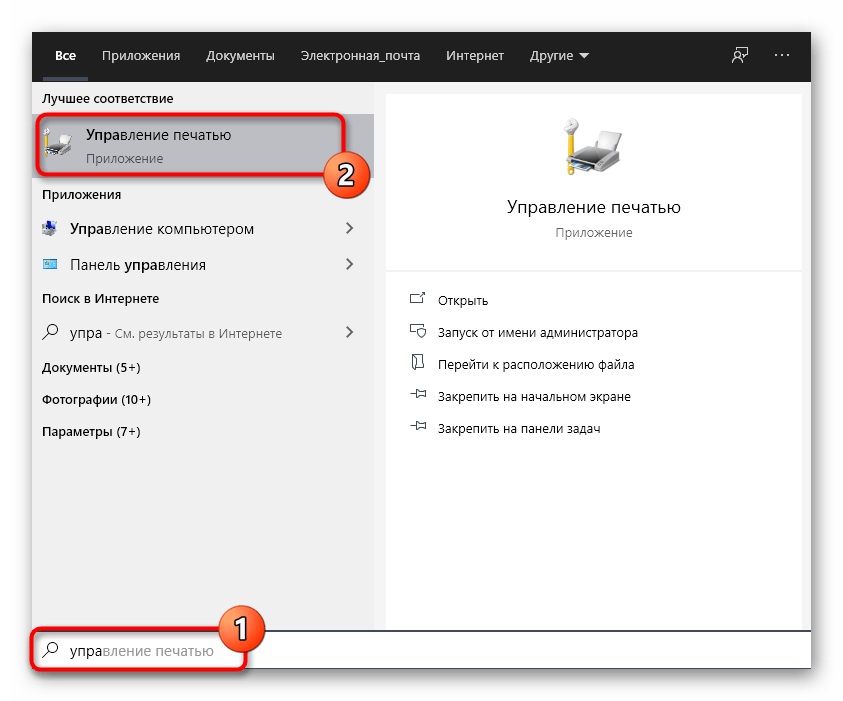 - Для открытия приложения «Управление печатью» разверните «Пуск» и введите его название в поиске.