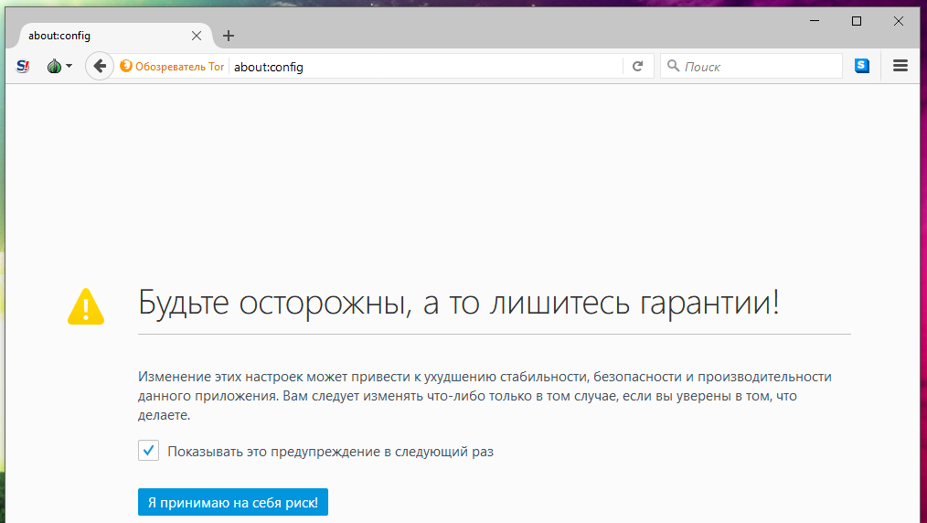 В адресно строке браузера введите about:config и нажмите кнопку «Я принимаю на себя риски!»: