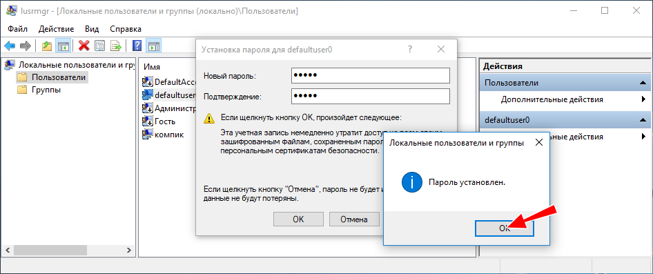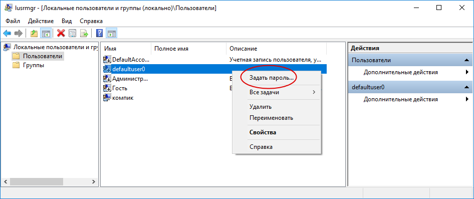Находясь в своей учетной записи администратора, откройте командой lusrmgr.msc оснастку управления пользователями, зайдите в раздел «Пользователи» и удалите учетную запись defaultuser0.