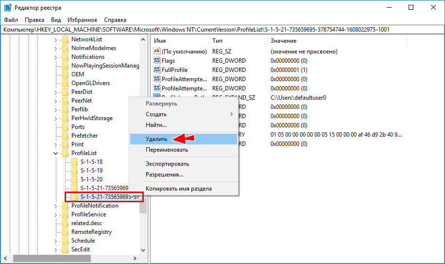 3. Удалить в реестре профиль учетной записи defaultuser0 в следующей ветке