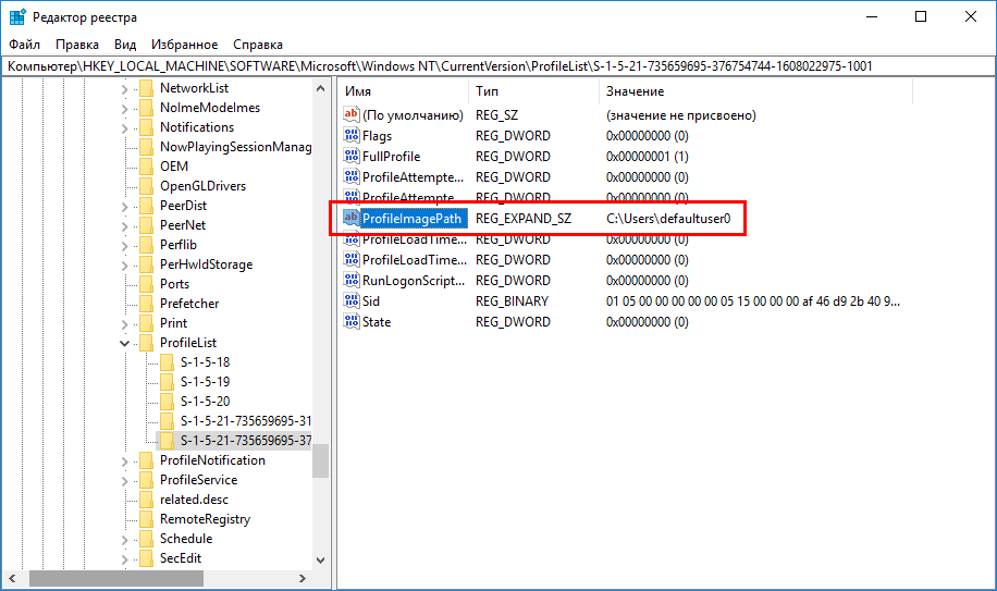 Разверните в редакторе реестра ключ HKLM\SOFTWARE\Microsoft\Windows NT\CurrentVersion\ProfileList и отыщите подраздел с названием S-1-5… и содержащимся в нём параметром ProfileImagePath, в качестве которого установлен путь «C:\Users\defaultuser0».