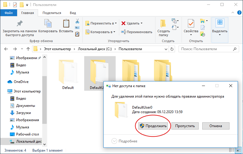 За сим зайдите в расположения C:\Users и удалите сам каталог defaultuser0 со всем его содержимым. Если система воспротивиться, удалите его, загрузившись в безопасном режиме или из-под LiveCD.
