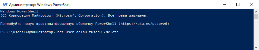 Удалить ее можно также и командой net user defaultuser0 /delete в запущенной с повышенными правами командной строке.