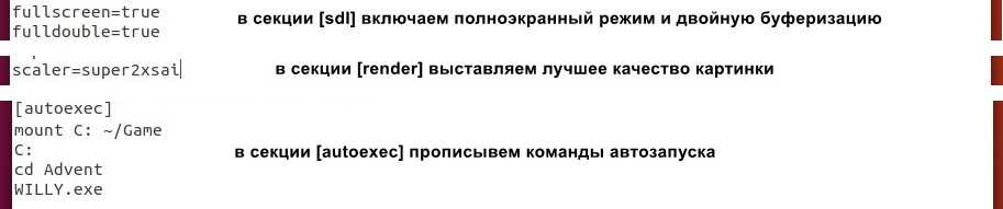 Для примера настроим DOSBox на автозапуск игры «The Adventures of Willy Beamish» таким образом, чтобы она запускалась в полноэкранном режиме.