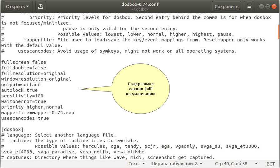 Содержимое файла представлено несколькими секциями, каждая из которых содержит набор параметров, отвечающих за те или иные аспекты работы приложения. В текущей версии имеются 14 секций, из которых наибольший интерес представляют sdl, dosbox, render и autoexec.