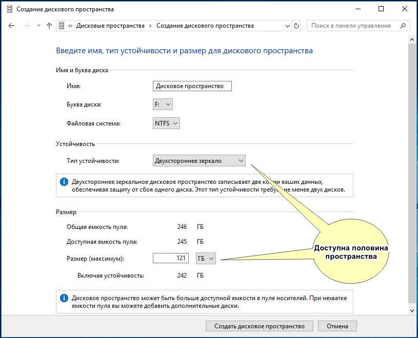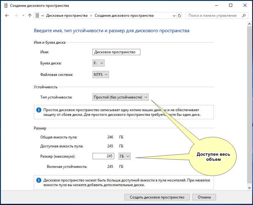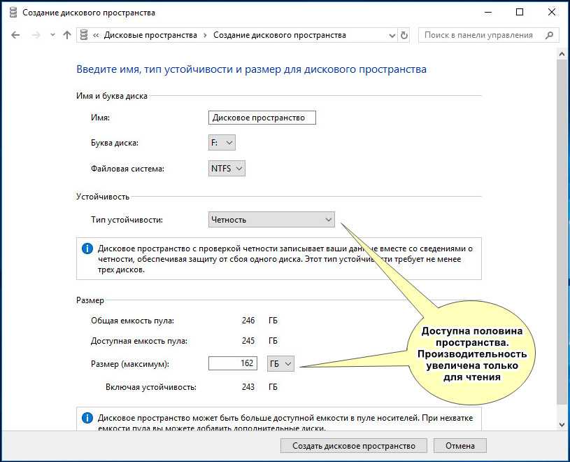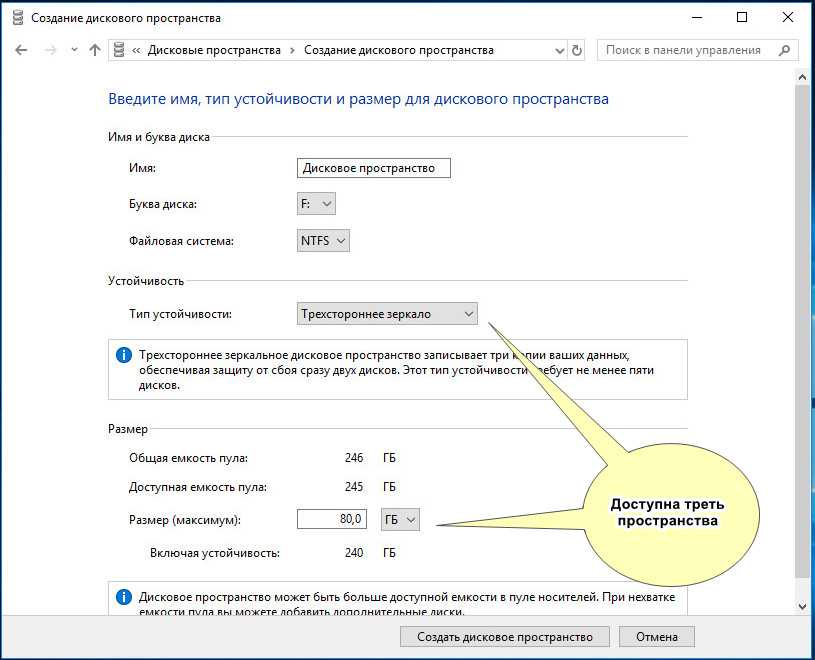 Итак, определившись с настройками, жмем «Создать дисковое пространство», объединяя тем самым физические накопители в один том.