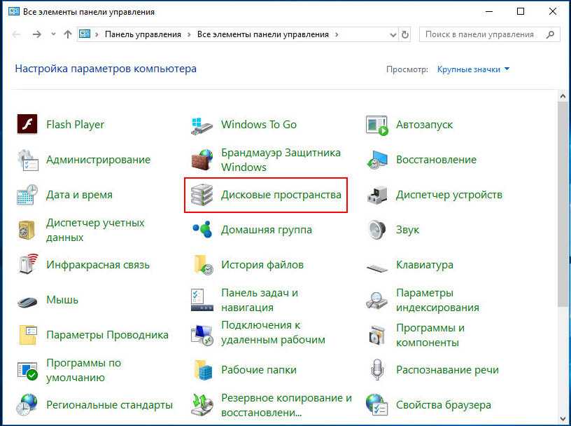 Зайдите в панель управления, запустите апплет «Дисковые пространства».