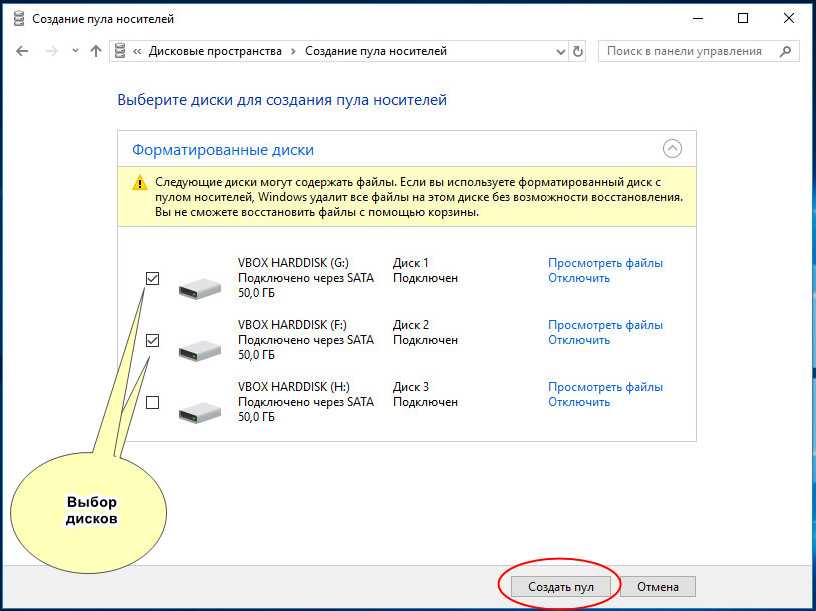 Далее вам нужно будет выбрать как минимум два жестких диска и нажать «Создать пул».