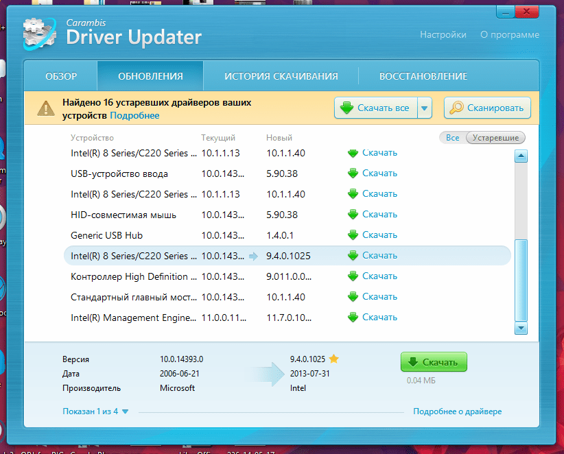 Можно запустить автоматическую установку всех элементов или выборочно скачать и установить свежие версии определенных драйверов. Для каждого из них предоставляется подробная информация — пользователь может увидеть текущую и новую версии, даты выпуска обоих вариантов, название производителя и размер установочного файла.