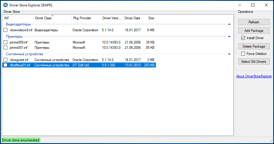 В правой части окна Driver Store Explorer имеется набор опций, позволяющих устанавливать драйвера через файл INF , а также удалять драйвера, в том числе в принудительном режиме, для чего требуется отметить чекбокс «Force Dеlеtion».