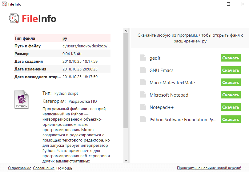 После этого откроется окно программы FileInfo, где пользователю предоставят информацию о файле: