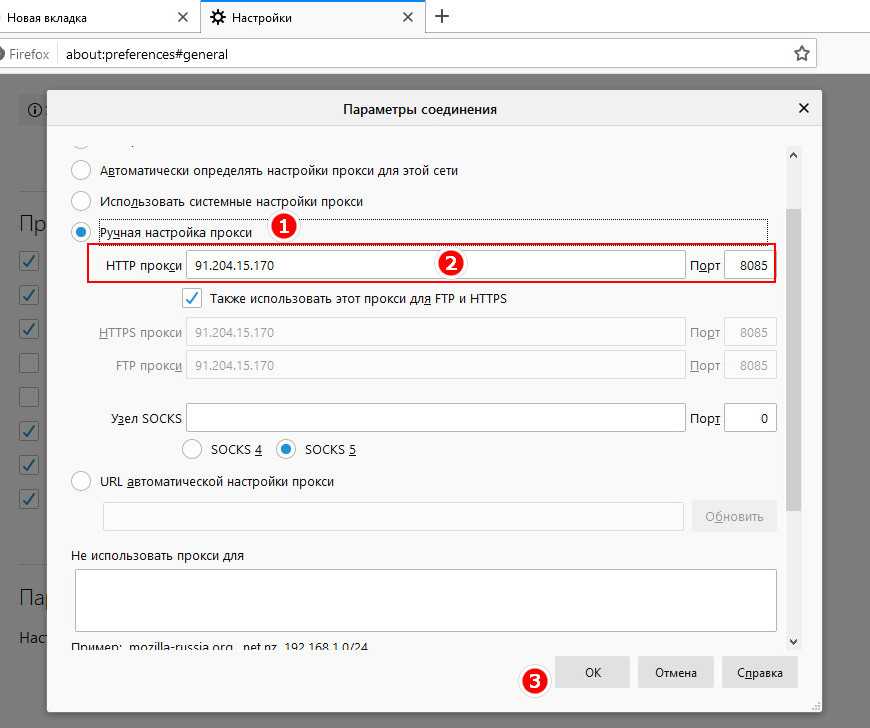Активируйте радиокнопку «Ручная настройка прокси» и вставьте в соответствующие поля «HTTP прокси» IP-адрес и порт.