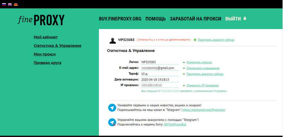 • Раздел «Статистика & Управление» содержит опции управления аккаунтом — смена пароля, отключение оповещений, продление аккаунта, смена IP привязки и тому подобное.
