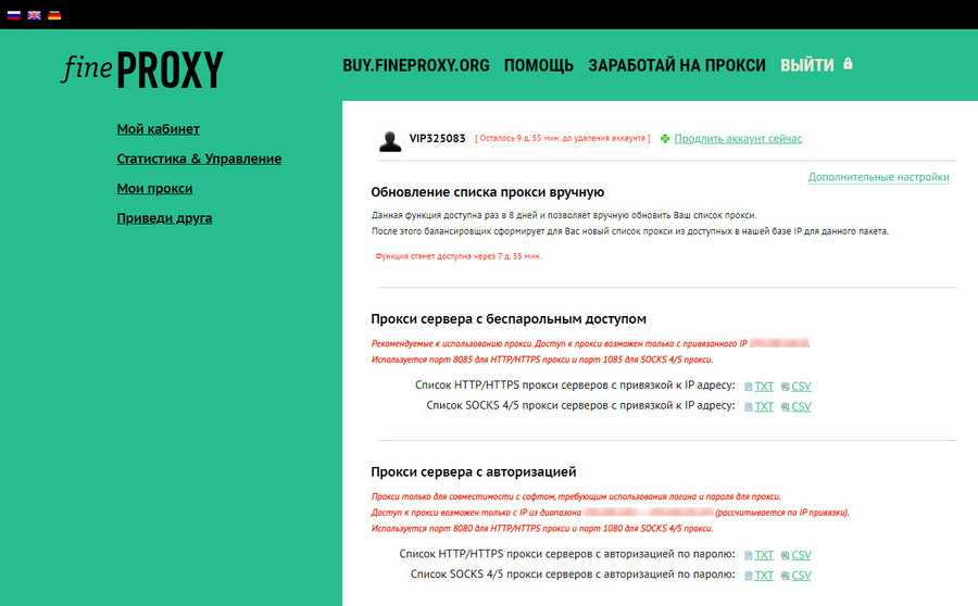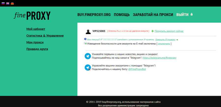 • В разделе «Мой кабинет» можно изменить IP-привязки, если вдруг понадобится подключиться к прокси-серверу с компьютера в другой сети с отличающимся от того IP, с которым вы впервые вошли в кабинет.