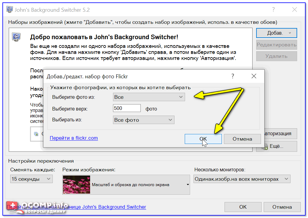После запуска у вас появиться главное окно настроек — нажмите по кнопке «Добавить» и укажите источник фотографий (обоев). Если у вас нет своей отдельной папки с отобранными картинками — рекомендую попробовать сервисы Flickr и Pixabay . (как у меня в примере ниже 👇)