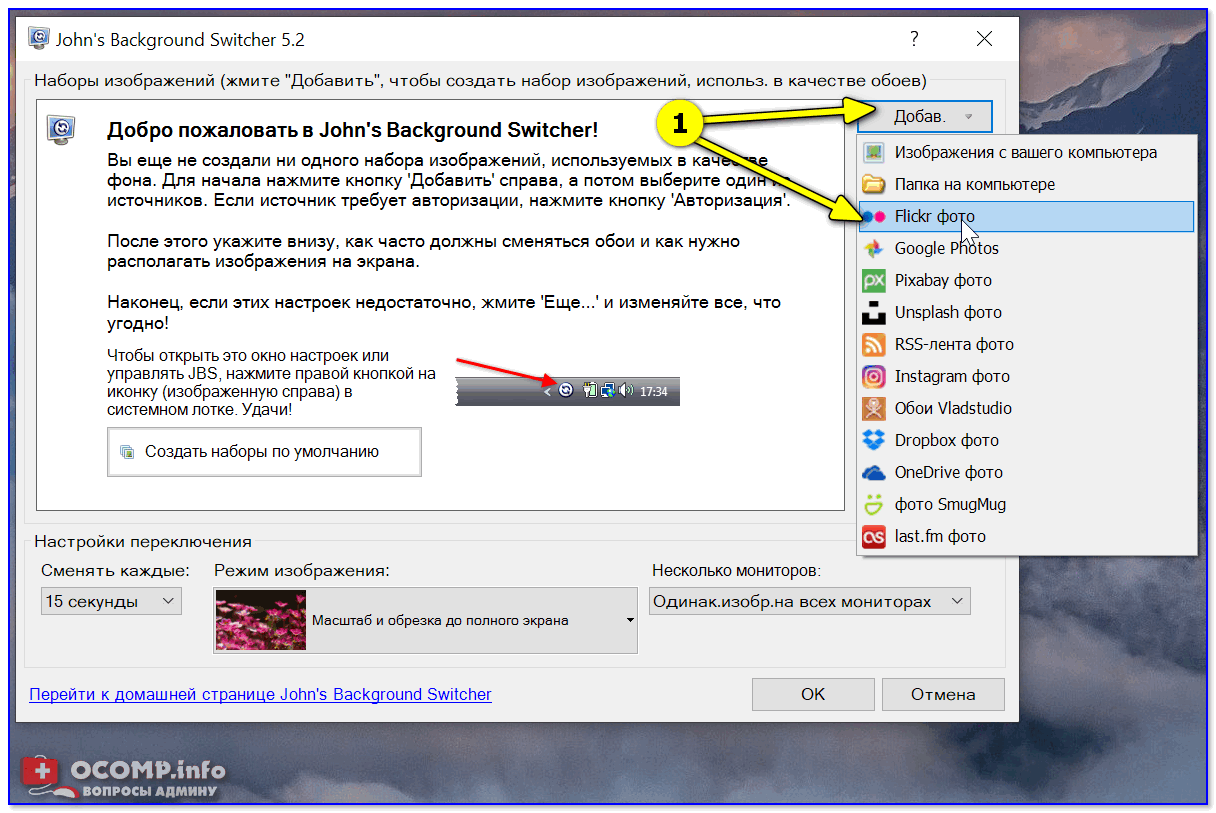 - во-первых, она может брать обои как из определенной вашей папки, так и из сервисов фото-хостингов: Flickr, Pixabay, Google Photos и пр. (т.е. вам не нужно даже загружать картинки — она сделает за вас это автоматически) ;