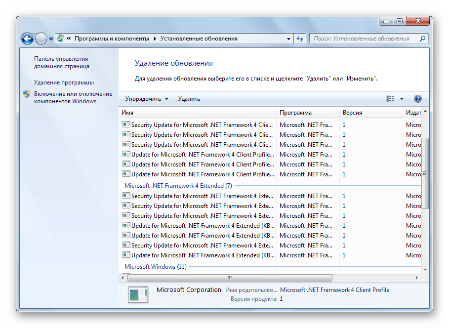 Отобразится таблица, где будут расположены все когда-либо установленные дополнения и исправления. Они группируются по именам, версиям и дате. Вы можете выбрать любое из них и произвести удаление.