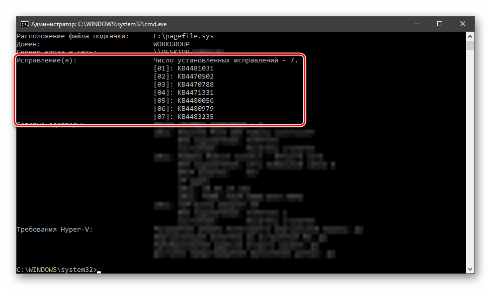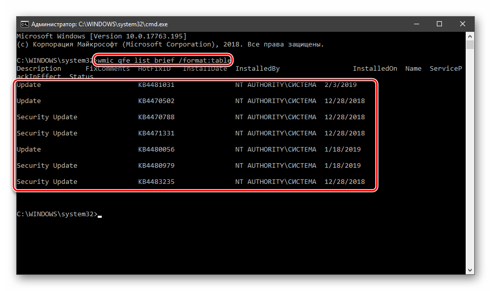 Первая команда выводит список обновлений с указанием их назначения (обычное или для обеспечения безопасности), идентификатора (KBXXXXXXX), пользователя, от чьего имени производилась установка, а также даты.