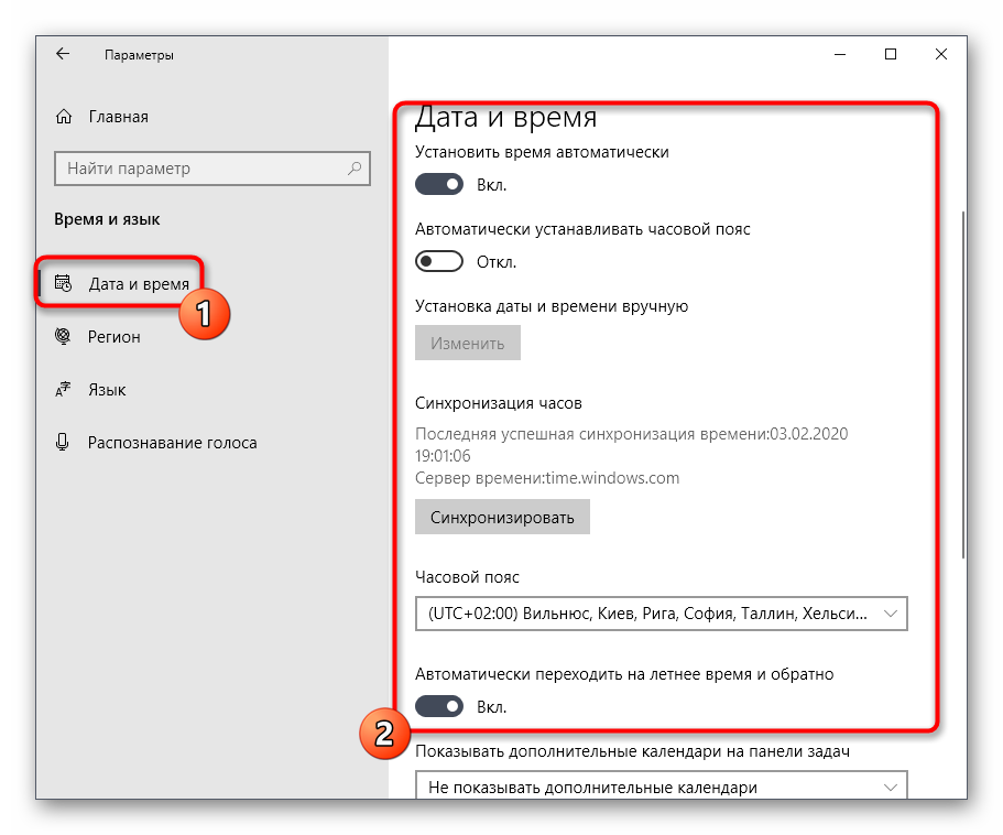 В первом разделе «Дата и время» убедитесь в том, что установлен параметр «Установить время автоматически». В противном случае вы можете самостоятельно задать текущее время и дату или нажать на «Синхронизировать» для обновления информации.