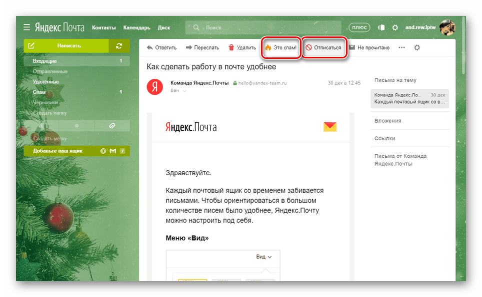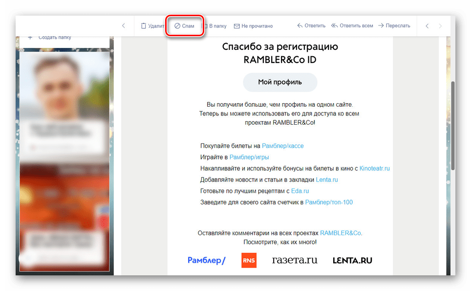 При отсутствии упомянутой выше ссылки вы можете воспользоваться кнопкой «Спам» на верхней панели инструментов. За счет этого вся цепочка писем, идущая от того же отправителя, будет расцениваться нежелательной и автоматически исключаться из «Входящих» сообщений.