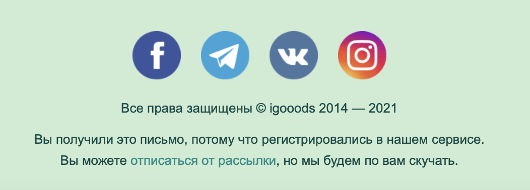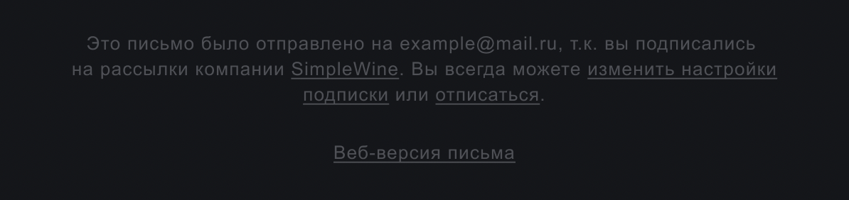Лучше поместить в футер или шапку веб-версию письма. Это позволит просмотреть письмо в браузере — случается, что в почтовике слетают картинки и вёрстка. Таким образом можно избежать потери подписчиков из-за технических неполадок.