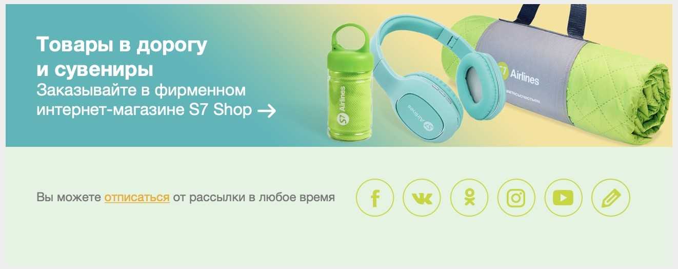 Авиакомпания S7 не прячет ссылку подписки, а оформляет её как часть футера рядом со ссылками на соцсети: