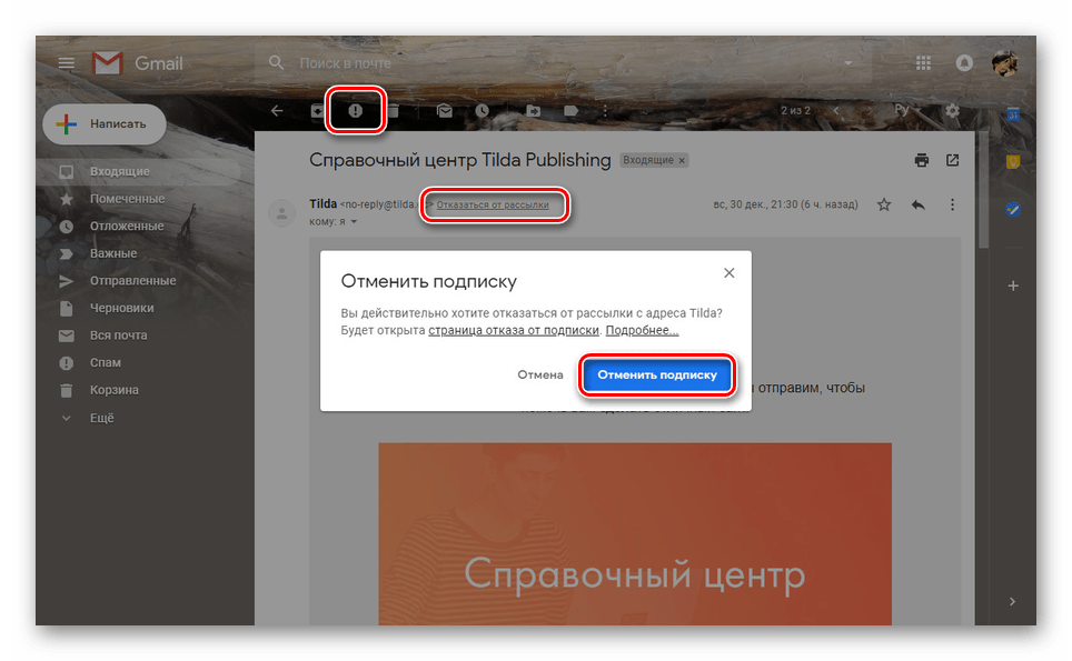 Несмотря на хорошую защиту почтового сервиса Gmail, позволяющую практически полностью изолировать ящик от спама, многие рассылки все же попадают в папку «Входящие». Избавиться от них можно с помощью ручного занесения «В спам», использования ссылки «Отписаться» при просмотре письма или прибегнув к специальным онлайн-сервисам.