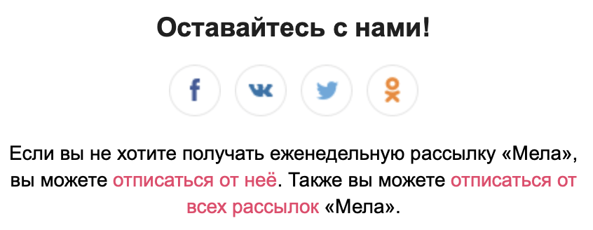 Медиа предлагают отписаться от одной или сразу всех рассылок, при этом дают возможность подписаться на соцсети: