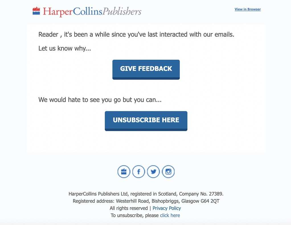 Издательство HarperCollins пишет, что подписчик давно не читает их письма и предлагает оставить обратную связь. Или отписаться — но им будет больно смотреть, как он уходит