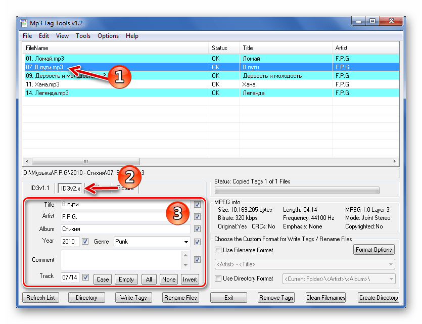 Теперь можно просто скопировать, что возможно, в ID3v1. Делается это через вкладку «Tools».