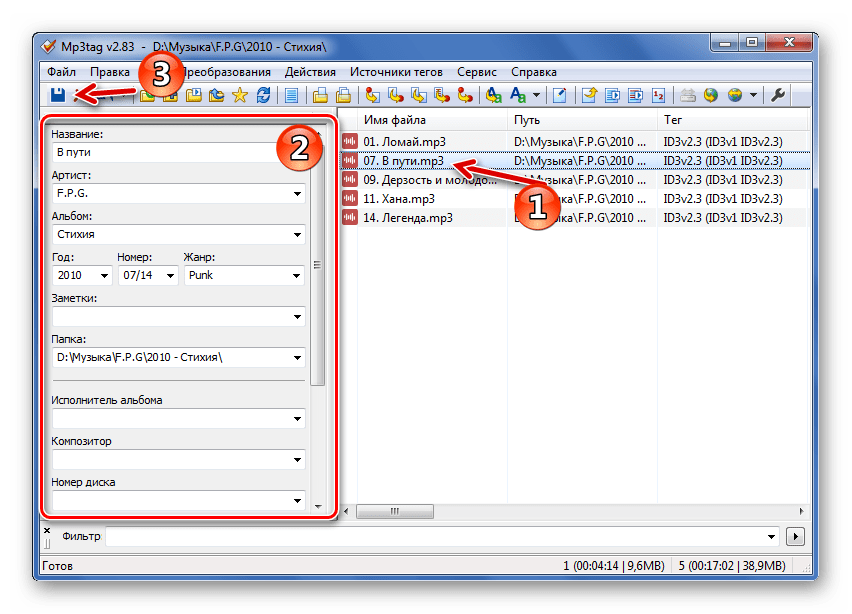 Выделив один из файлов, в левой части окна Вы сможете увидеть его теги и отредактировать каждый из них. Для сохранения правок нажмите значок на панели.