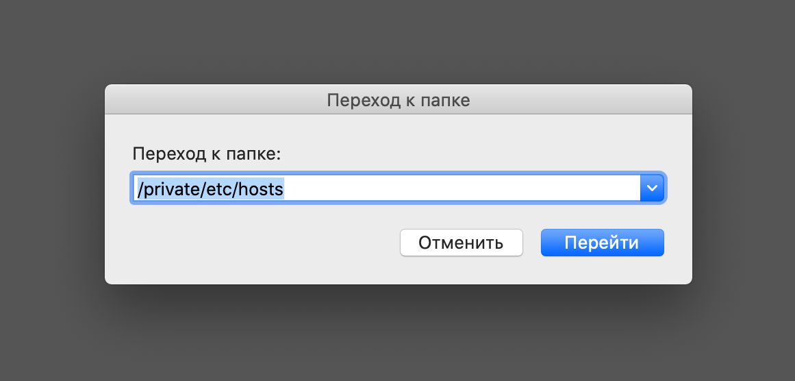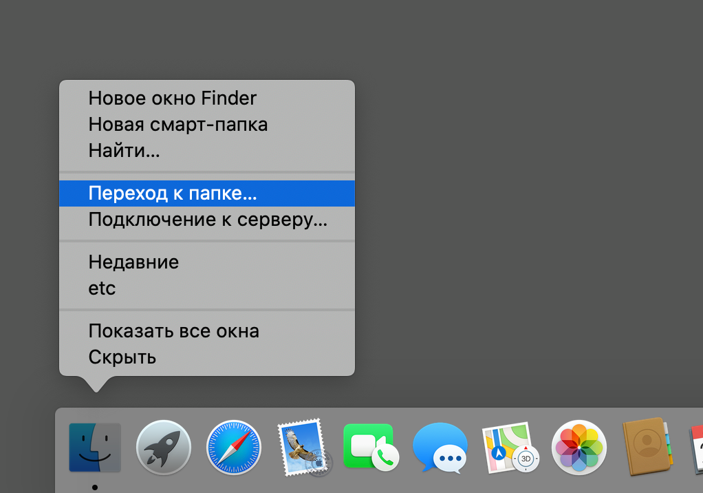 В MacOS, для добавления соответствия домена и IP-адреса в файл hosts откройте контекстное меню файлового менеджера Finder. Для этого, нажмите правой кнопкой мыши на иконку Finder, или после наведения курсора на иконку коснитесь двумя пальцами тачпада. Затем, выберите Переход к папке.