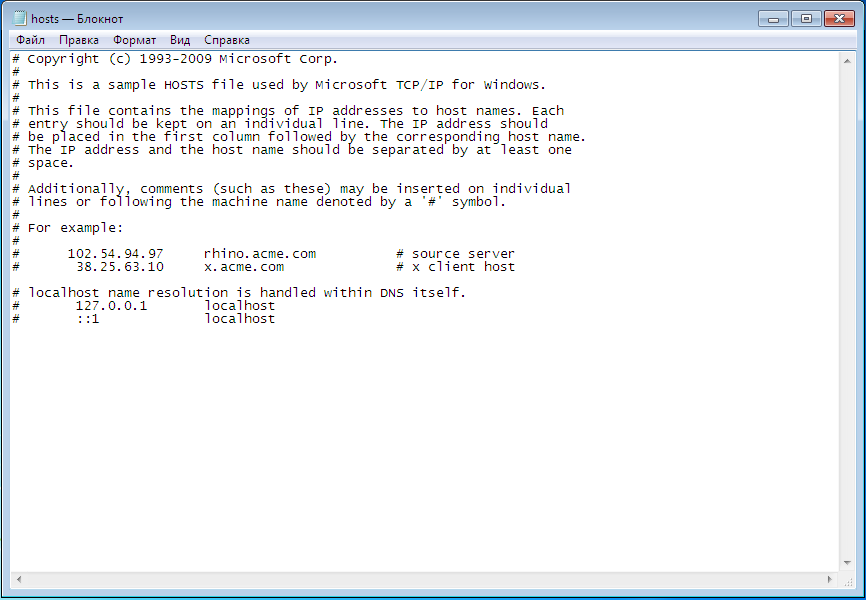 Вот мы и узнали для чего и как работает hosts файл. Теперь давайте посмотрим что в нем содержится.