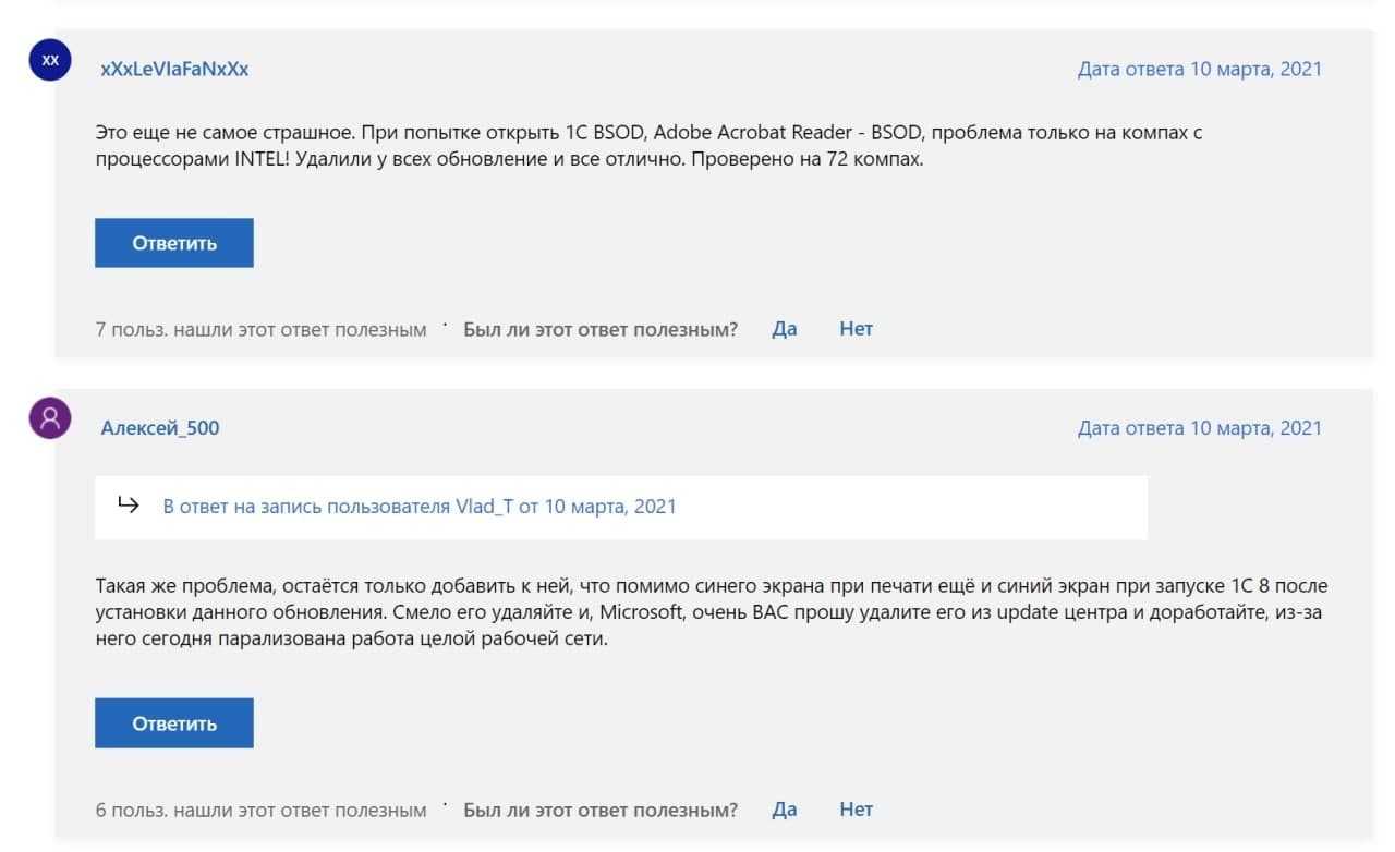Несколько тем на форумах, где у пользователей начались BSOD после установки обновлений от 09.03.2021: