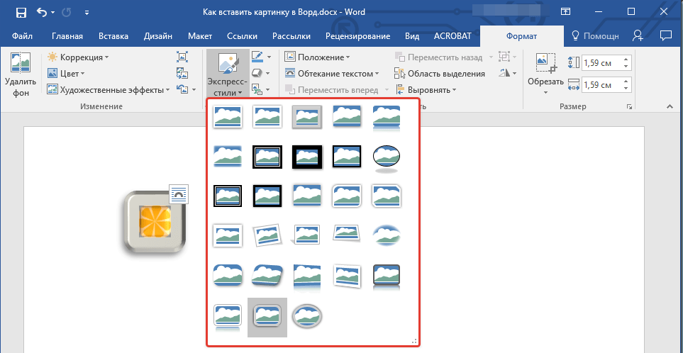 Стили рисунков: используя инструменты “Экспресс-стили”, вы можете изменить внешний вид добавленного в документ изображения, в том числе и форму отображения графического объекта.