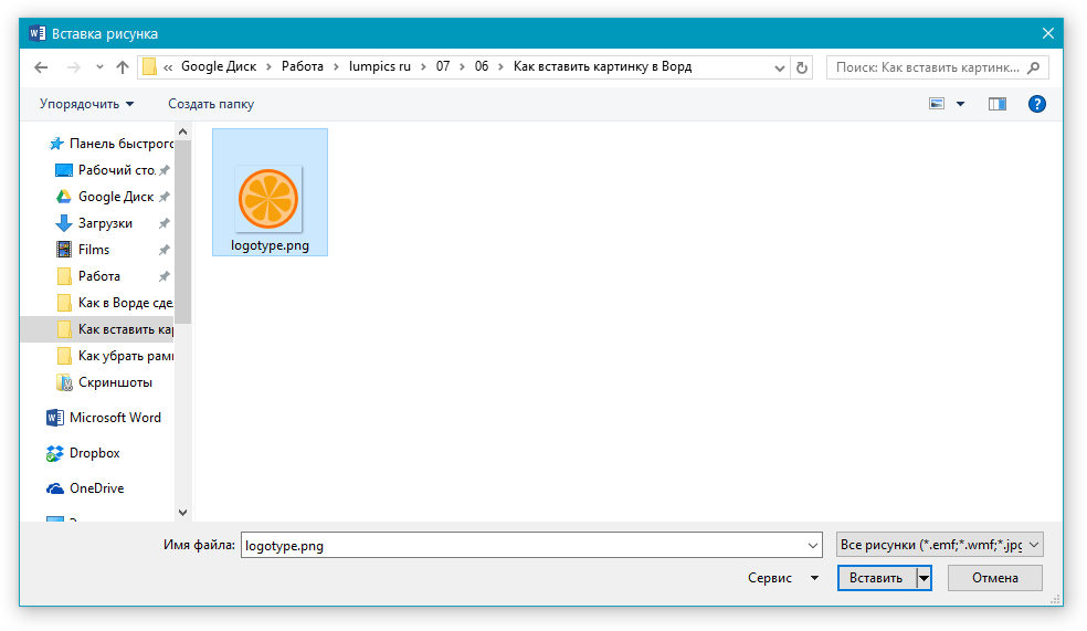 4. Выбрав файл (картинку или фото), нажмите кнопку “Вставить”.