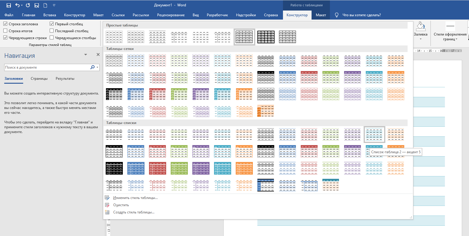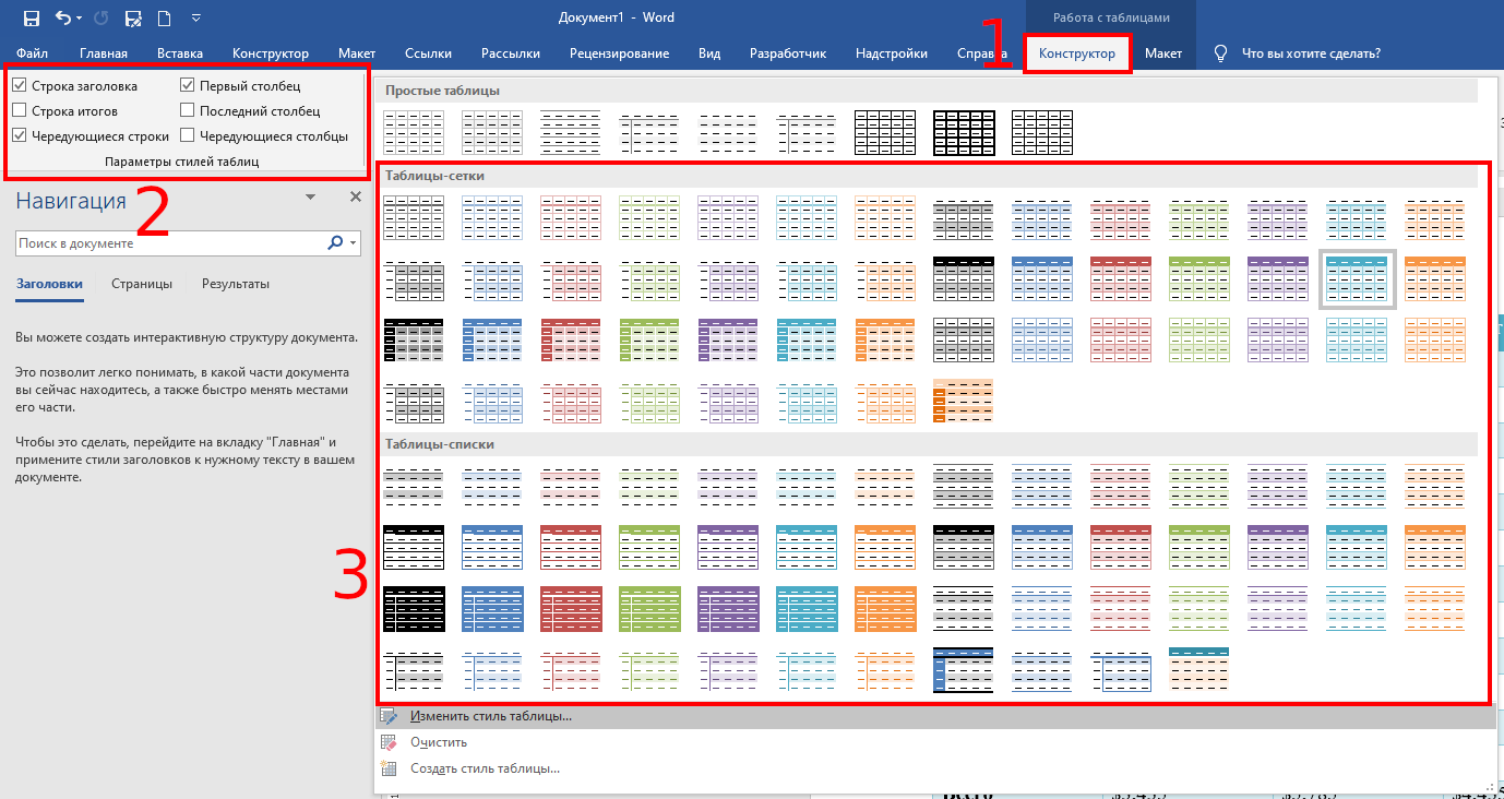 Сразу после вставки таблицы откроется вкладка «Конструктор». Эту же вкладку можно открыть если выбрать таблицу и нажать кнопку «Конструктор». Разверните пункт «Стили таблиц», чтобы увидеть подготовленные варианты: