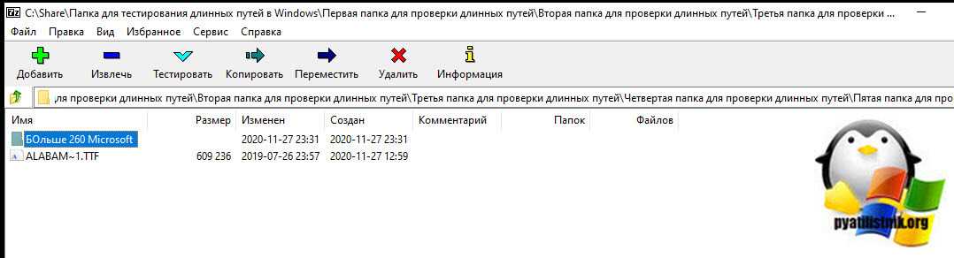 Наверняка многие знают архиватор 7Zip, но мало кто пользуется его файловым менеджером 7zFM.exe, а зря именно он может вам помочь в ситуации с сообщением «Слишком длинный целевой путь» или «Слишком длинный конечный путь». Вот у меня есть тестовая директория, у которой уже есть 260 символов в пути, и я не могу там создавать новую папку.