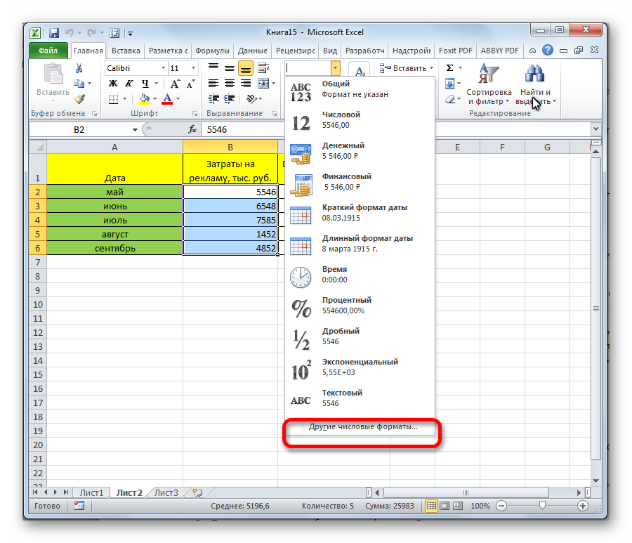 Но в указанном списке представлены только основные форматы. Если вы хотите более точно указать форматирование, то следует выбрать пункт «Другие числовые форматы».