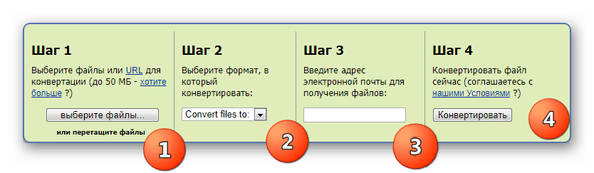 Простой и понятный онлайн-сервис содержит пошаговою инструкцию и детальную информацию про каждый формат, но из-за лимита и возможности получения конвертируемого файла только по электронной почте, подойдет не для всех задач.