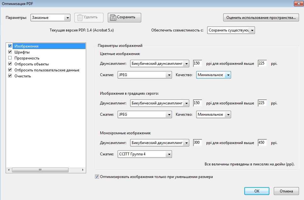 4. Вы можете удалять изображения, делать их из цветных черно-белыми, сжимать, менять разрешение, менять встроенные шрифты и т.д. «Наигравшись» с параметрами, нажмите на кнопку «Ок» и сохраните оптимизированный файл в нужную директорию.
